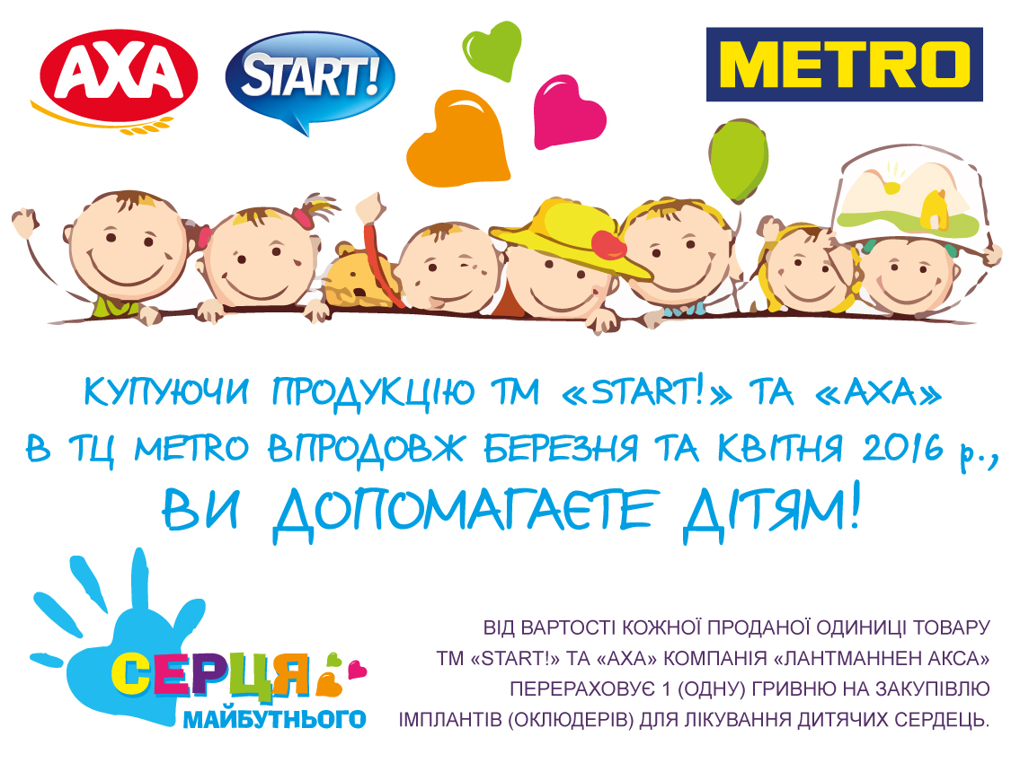За умовами програми, 1 гривня від вартості кожної проданої одиниці продукції ТМ АХА та START!в магазинах METRO буде спрямована на закупівлю медичного обладнання, а саме оклюдерів – імплантів, що використовуються під час кардіо-операцій на дитячих серцях лікарями Національного інституту серцево-судинної хірургії імені Амосова АМН України. Акційний асортимент товарів нараховує 49 одиниць продукції торгових марок АХА та START! від компанії «Лантманнен Акса».