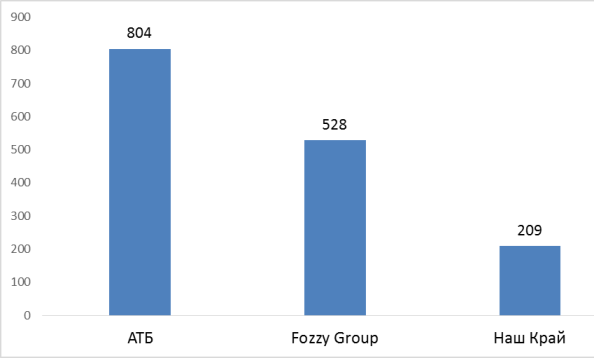 ТОП 3 продовольственных ритейлера Украины по общему числу магазинов, март 2016 г., ед.