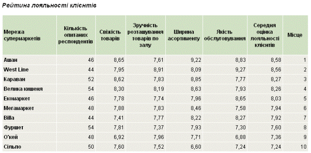 Найбільш лояльними були відвідувачі "Ашану" та мережі супермаркетів West Line. У першому найвищу оцінку отримала ширина асортименту, а в другому - якість обслуговування.