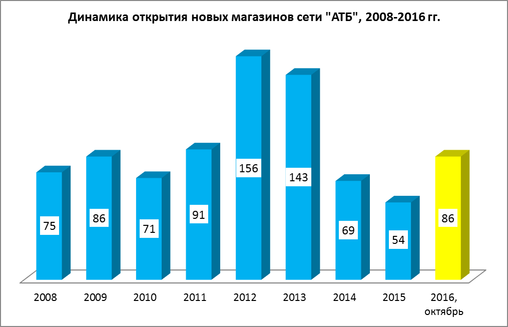 В целом, в период с января по октябрь 2016 г. "АТБ-маркет" открыл 86 новых объектов. Для сравнения отметим, что за аналогичный период 2015 года в стране появилось 35 новых дискаунтеров этого ритейлера - так что можно утверждать, что в текущем году динамика экспансии «АТБ» выросла более чем в 2 раза. Также напомним, что за весь 2014 г. в стране было открыто 69 новых объектов "АТБ", а в 2015 г. - 54 объекта (по своей текущей динамике экспансии сеть недотягивает лишь до показателей 2012 и 2013 гг., когда было открыто 156 и 143 ее магазина соответственно).