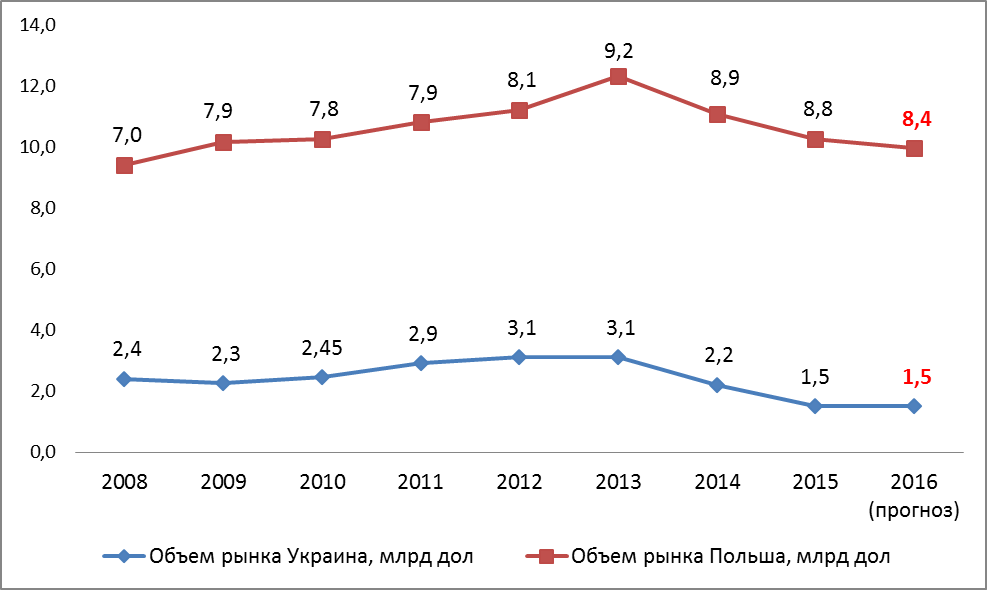 Объемы продаж FMCG гипермаркетов в Украине и Польше, 2008-2016 гг., млрд USD