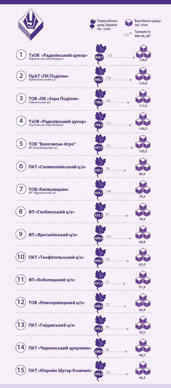 Лидером по производству сахара в 2016/2017 МГ стал Радеховский сахарный завод, который за четыре месяца производства наварил 140,5 тыс. т сахара из 908,7 тыс. т сахарной свеклы.