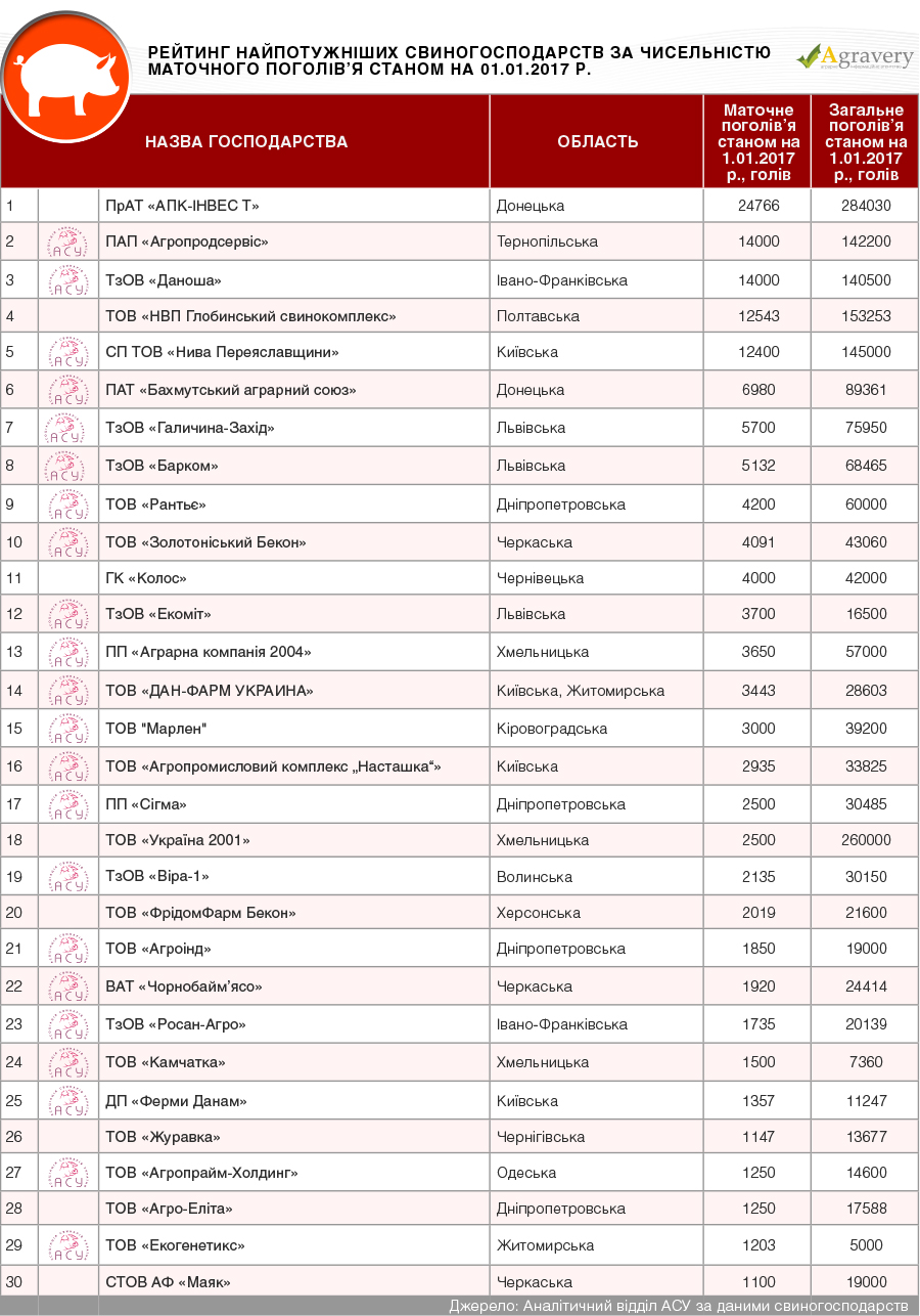 Ассоциация свиноводов Украины составила рейтинг крупнейших свиноводческих хозяйств по состоянию на начало 2017 г. Об этом сообщает Agravery.