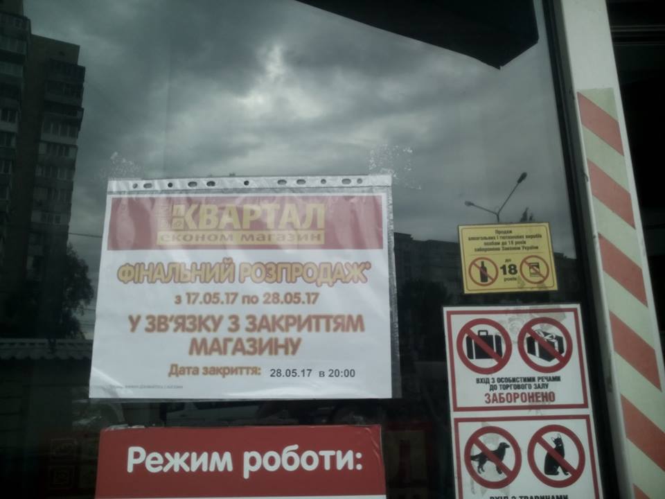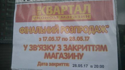 Прошлые выходные стали последними рабочими днями для 2 магазинов сети "Квартал" в Белой Церкви. На фасадах маркетов были вывешены объявления о финальной распродаже товаров в связи с грядущим закрытием точек. Начиная с понедельника 29 мая объекты уже не работают.