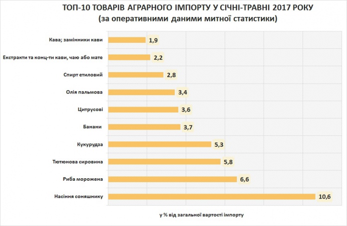 Рейтинг аграрного импорта возглавляют семена подсолнечника (≈12%), которые ввозятся в Украину как посевной материал. Также в ТОП-10 позиций импорта вошли: рыба мороженая, табачное сырье, кукуруза, бананы, цитрусовые, пальмовое масло, спирт этиловый, экстракты, кофе.