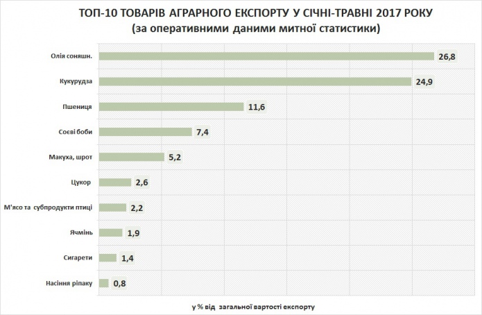Кроме указанных товаров, к десятке ведущих экспортных позиций относятся также соевые бобы, твердые отходы масличных культур (жмых, шрот), сахар, мясо и субпродукты птицы, ячмень, сигареты и семян рапса. В целом удельный вес указанной десятки товаров составила почти 85% от стоимости украинского экспорта за 5 месяцев текущего года.