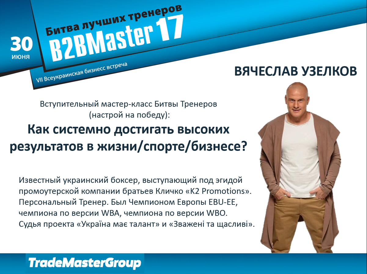 Откроет Битву Тренеров Мастер-класс Вячеслава УЗЕЛКОВА, известного украинского боксера, выступающего под эгидой промоутерской компании братьев Кличко «K2 Promotions». Вячеслав даст всем настрой на победу, расскажет о том, «Как системно достигать высоких результатов в жизни/спорте/бизнесе».