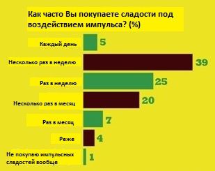 Каждый опытный ритейлер хорошо осведомлен о том, что часто на кассе у клиентов есть желание что-нибудь перекусить. Исследование Skilltelligence подтверждает, что почти 40% потребителей могут увлечься по наитию на «чем-то сладким» в среднем по несколько раз в неделю, но только 5% позволяют себе незапланированные покупки сладостей каждый день. 25% посетителей тянутся к сладостям возле касс раз в неделю, а пятая часть – несколько раз в месяц. Только 1% анкетированных утверждает, что вообще не покупает импульсных сладостей. На вопрос: «Какие импульсные сладости Вы покупаете чаще всего?», 3/5 респондентов ответили «батончики», 18% - «мороженое», 13% - «вафли», 9% - «жевательные резинки», а 2% - «яйца с сюрпризом».
