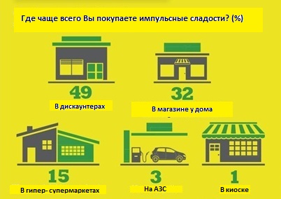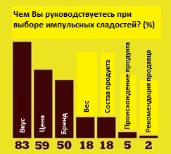 Также выяснилось, что посетители магазинов при выборе импульсных сладостей чаще всего основываются на вкусе продукта – так ответили 83% респондентов. Очень важна, конечно же, цена, на которую обращают внимание 59% потребителей, а также бренд, о чем заявляет каждый второй опрошенный. Без внимания не остались также вес, состав и происхождение товара. Импульсные сладости чаще покупают в дискаунтерах (50%) и магазинах у дома (32%). Интересно, что в этом отношении гипер- и супермаркеты опережают АЗС и киоски.