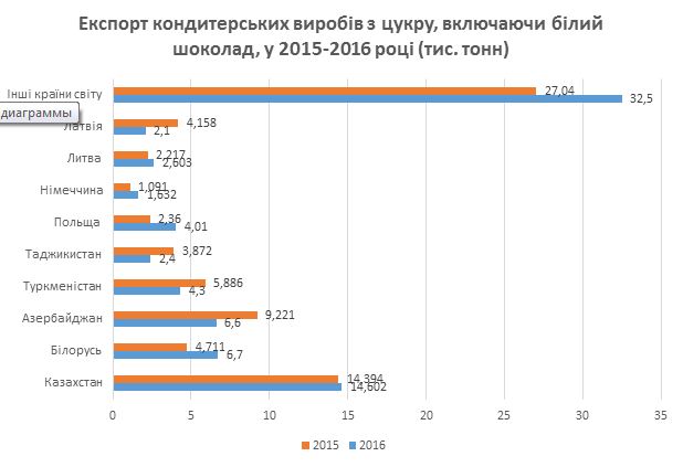 Согласно данным Государственной службы статистики,объем экспорта кондитерских изделий из сахара (включая белый шоколад) в целом за 2016 году составил 77,46 тыс. тонн, что на 1,9% больше показателя за 2015 год. За первые шесть месяцев текущего года из Украины было экспортировано 37,4 тыс. тонн кондитерских изделий из сахара, что на 5,2% больше прошлогоднего показателя за указанный период.