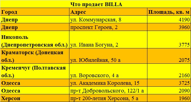 BILLA Украина совсем недавно заявила об уходе из регионов и решении продать все супермаркеты, кроме киевских. Пока что компания управляет 34 супермаркетами. Проданы могут быть девять объектов BILLA: в Днепре, Никополе (Днепропетровская область), Краматорске (Донецкая область), Кременчуге (Полтавская область), Одессе и Херсоне.