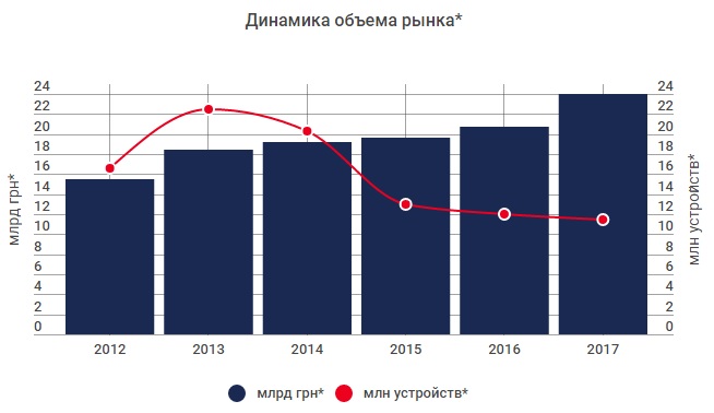 Лучшие результаты традиционно показывает только сегмент смартфонов, на который приходится примерно 40% рынка бытовой техники и электроники. По информации Эльдорадо, продажи мобильных устройств за шесть месяцев этого года увеличились на 37% — до 8,5 млрд грн. Продажи компьютеров выросли на 10%, а ноутбуков — на 15%, добавляет глава правления сети Diawest Анатолий Балюк.