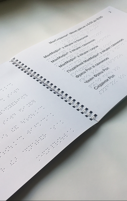 Инициативу по введению меню для незрячих людей компания МакДональдз® реализовала в сотрудничестве с Украинским обществом слепых (УТОС), которое помогло полностью адаптировать и изготовить основное меню заведений шрифтом Брайля.