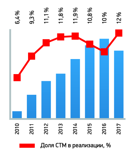 В ближайшие пять лет компания намерена нарастить долю СТМ в обороте до 25%. По словам Елены Соловьевой, такой показатель является оптимальным для ритейлера и способен существенно снизить зависимость от поставщиков-монополистов.