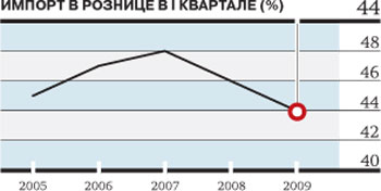 44 процента составляли в товарных ресурсах розничной торговли России в первом квартале 2009 года импортные товары. За год этот показатель, характеризующий долю импорта в обороте розничных операторов, снизился всего на 2%, несмотря на валовое сокращение импорта в Россию за тот же период 2009 года, по данным Федеральной таможенной службы, на 39%.