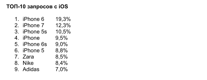 В то же время, владельцы гаджетов компании Apple демонстрировали верность любимому бренду: первые 6 позиций топ-10 застолбили различные модели гаджетов Apple. Первое место за iPhone 6. Замыкают список их поиска ритейл бренды: Zara, Nike, Adidas и единственный запрос, лишенный конкретики - платье.