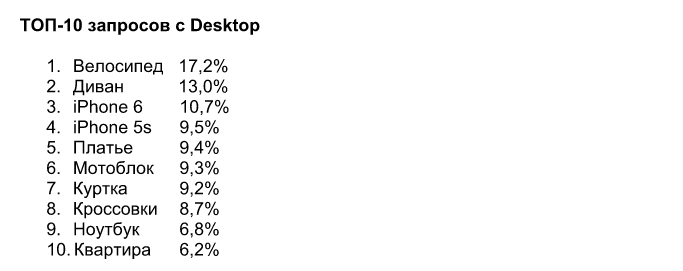 Владельцы ПК и ноутбуков проявили интерес к мотоблокам - 6 место и вполне ожидаемый - к телефонам iPhone 6 и 5s - 3 и 4 места. В остальном их запросы практически идентичны запросам пользователей Android.