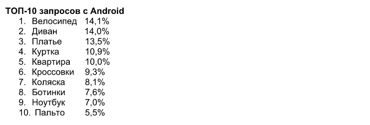 Как сказано в сообщении компании, пользователи Android активно обновляли гардероб: половину запросов из верхней десятки рейтинга составили одежда и обувь. Первое место в списке занял велосипед - пишет ЛIГАБiзнесIнформ