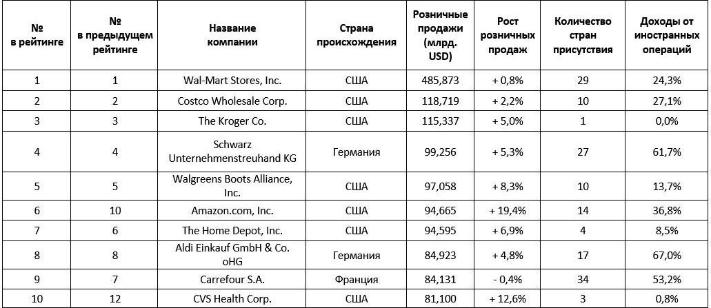 Призерами остаются американские оффлайн-сети – Walmart, Costco и Kroger. Германская Schwarz Group сохранила 4-е место, несмотря на влияние ослабления евро на результаты, выраженные в долларах. В будущем позиция группы должна улучшиться благодаря экспансии сети Lidl на американском рынке.
