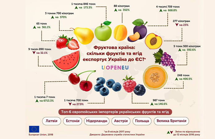 Лидерами импорта украинских ягод и фруктов в Европейский союз по итогам 9 месяцев 2017 года стали Латвия, Эстония, Нидерланды, Австрия, Польша и Великобритания.