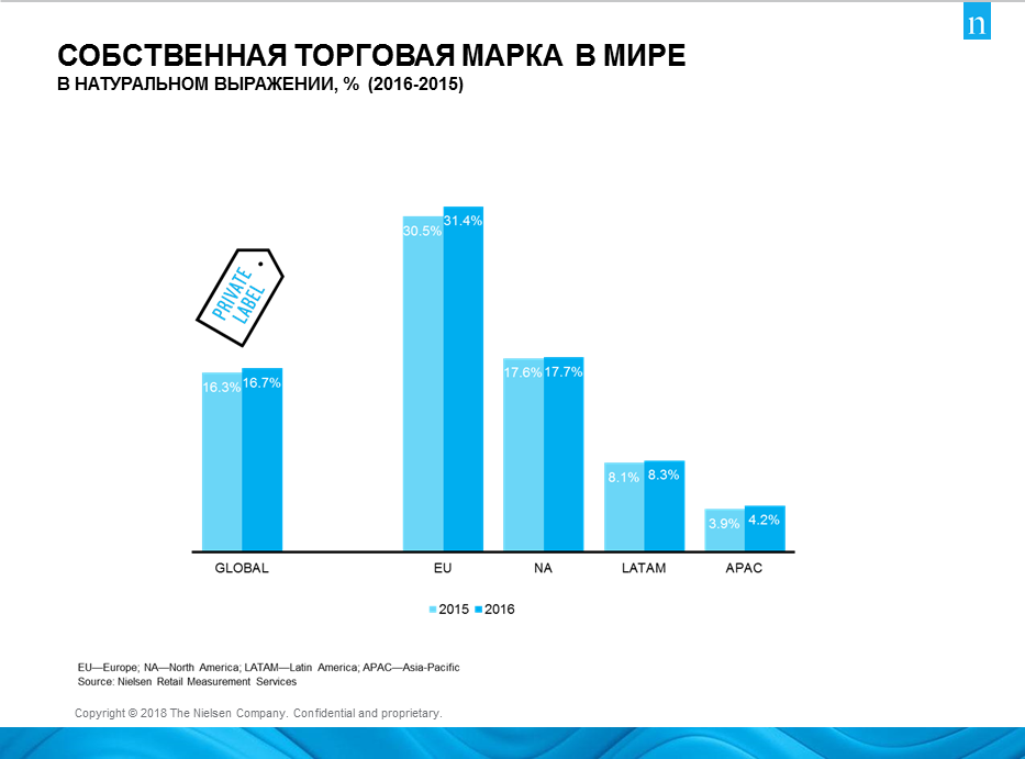 Похожая ситуация, где возможности для развития частных марок сетей велики, наблюдается в странах Латинской Америки, Северной Америке и в странах Тихоокеанского региона, где доля СТМ составляет ниже 20%, по данным 2016 года.