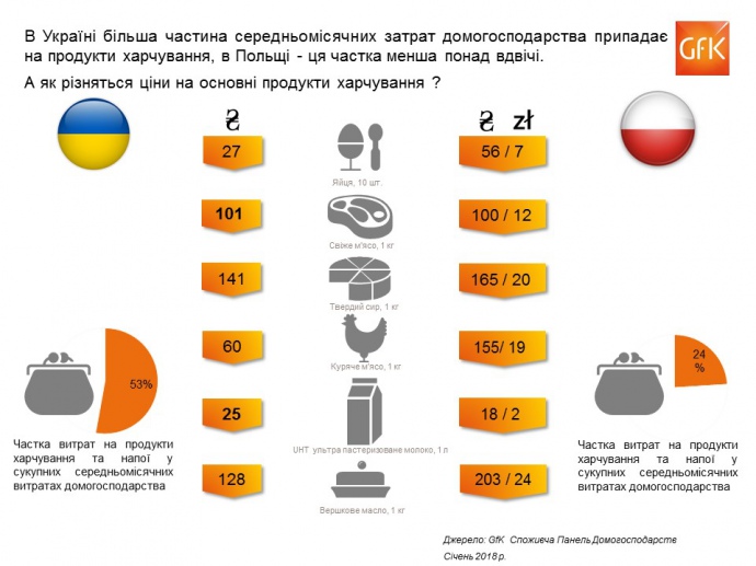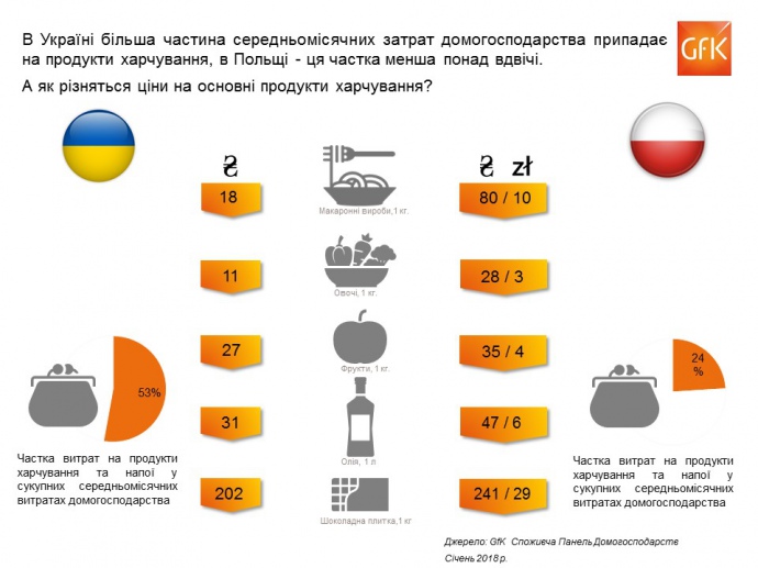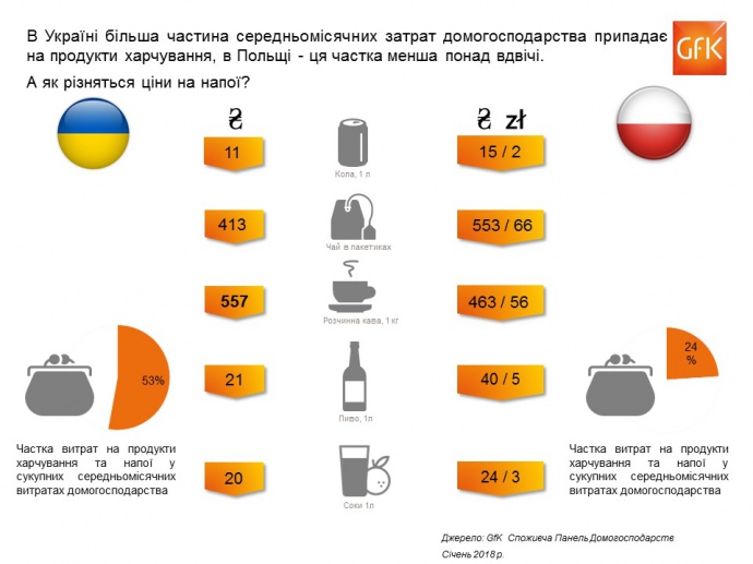 Компания GfK с помощью данных потребительской панели домохозяйств сравнила, сколько платит домохозяйство в Украине и в Польше за повседневные продукты и напитки.