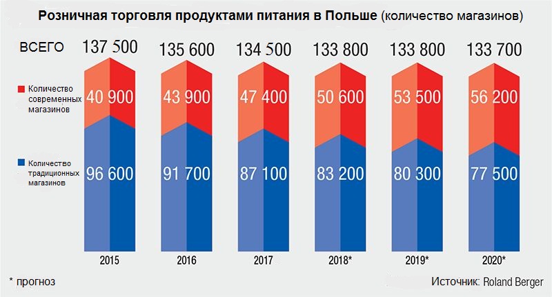 В 2017 году объем польского рынка FMCG увеличился на 4,3%, достигнув 230 млрд. злотых. К 2020 году он должен вырасти еще на 10% (22 млрд. злотых).