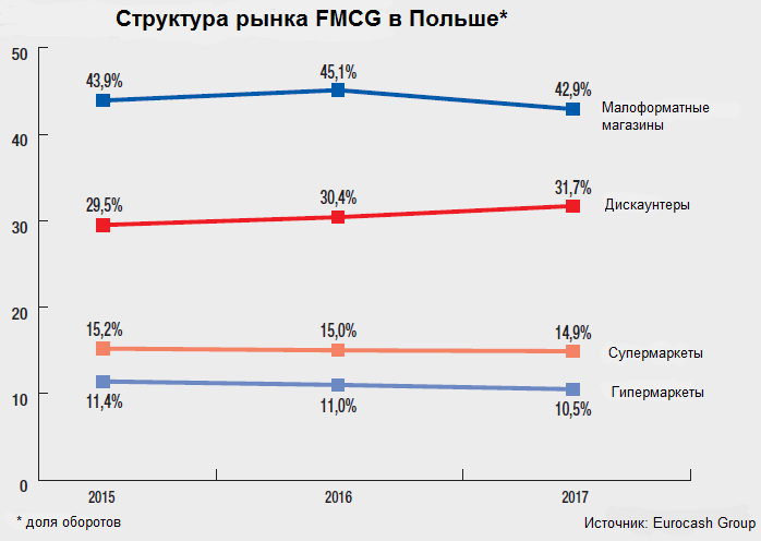 Крупноформатные магазины (гипермаркеты, супермаркеты и дискаунтеры) в целом отвечают за 57% оборота всей розничной торговли продовольственными товарами в Польше, в то время как малоформатные объекты (средние продуктовые магазины, минимаркеты, специализированные магазины, киоски, АЗС) – почти за 43%.