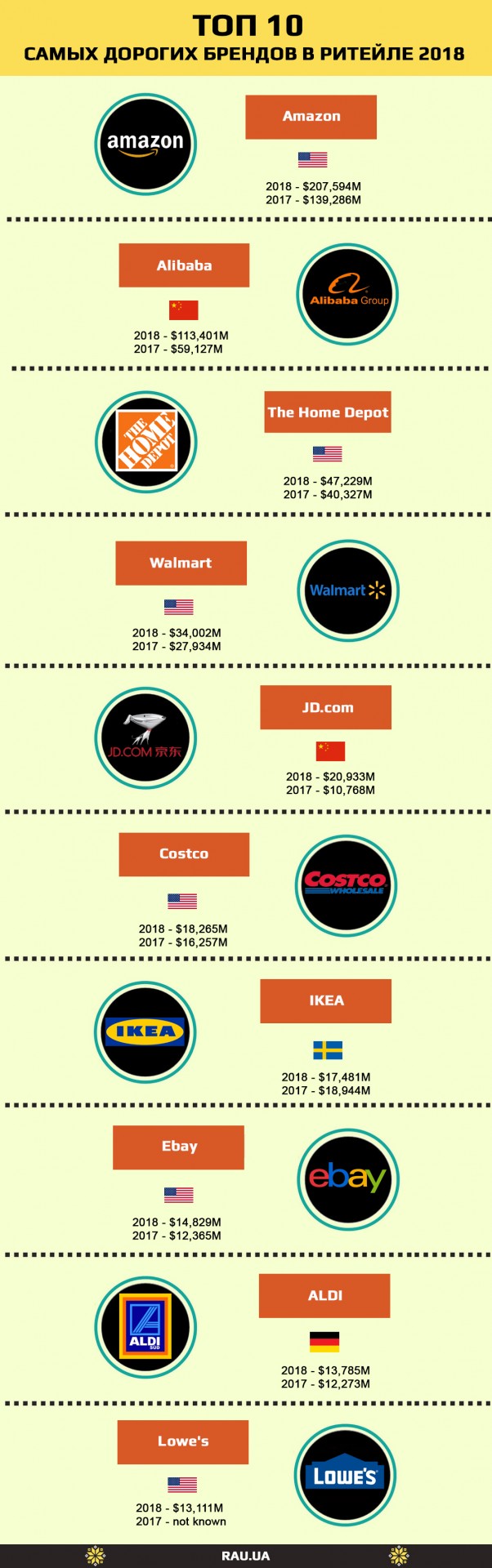 RAU составила инфографику — кто входит в топ-10 самых дорогих брендов среди мировых ритейлеров.
