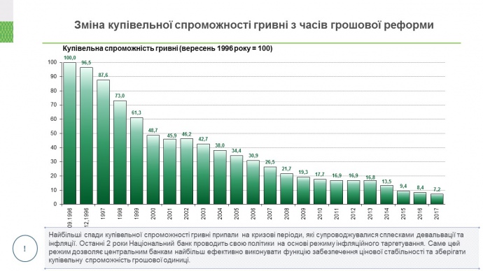 Национальный банк объясняет снижение покупательной способности гривни с 1996 года в 14 раз кризисными периодами, которые сопровождались всплесками девальвации и инфляции.