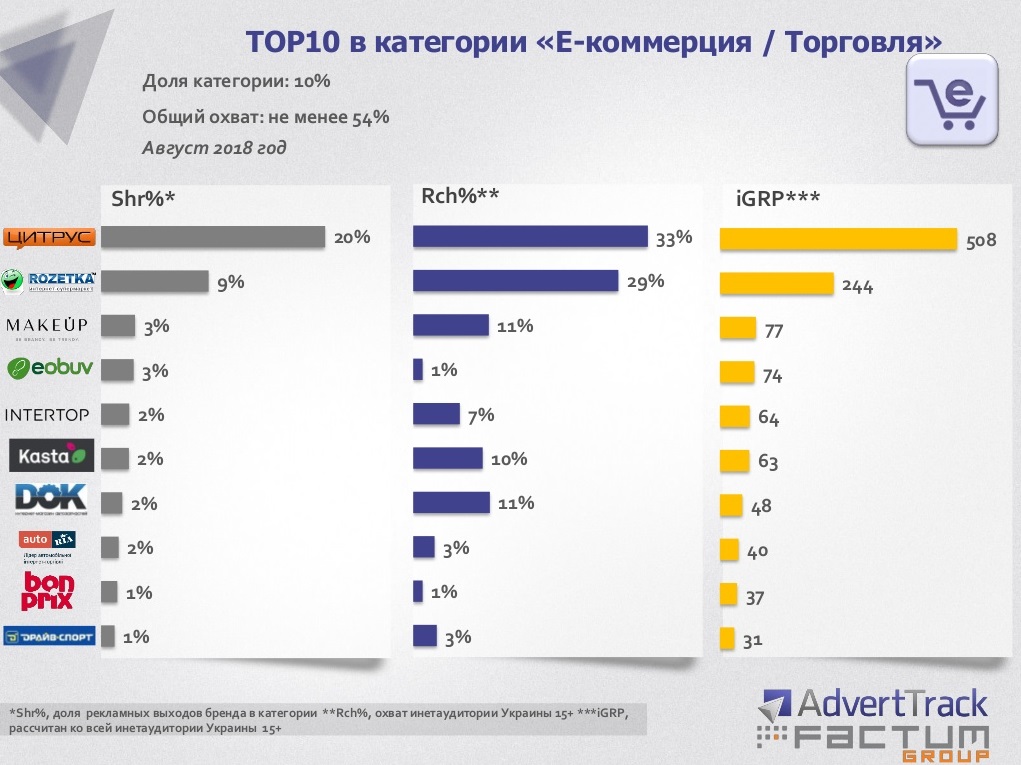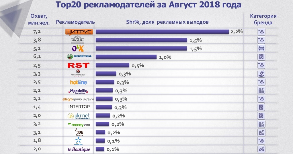 Любопытно, что по доле выходов видеорекламы безусловным лидером августа стал интернет-супермаркет Rozetka с показателем 7,6%. В топ-20 крупнейших также вошли крупные сети техники и электроники Comfy и Алло.