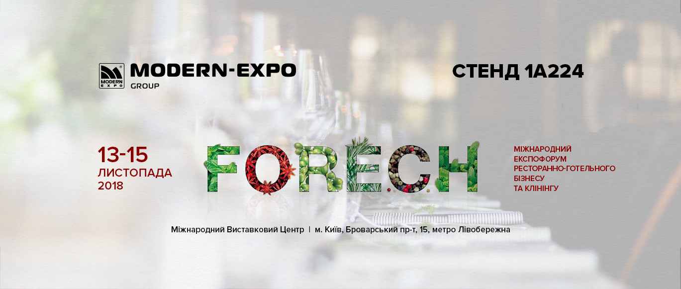 Компания Modern-Eхро Group станет участником международного экспофорума ресторанно-отельного бизнеса и клининга FoReCh. Это главное профессиональное событие сектора HoReCa в Украине, которое состоится в ноябре в Киеве и является чрезвычайно интересным для бренда Modern-Eхро.