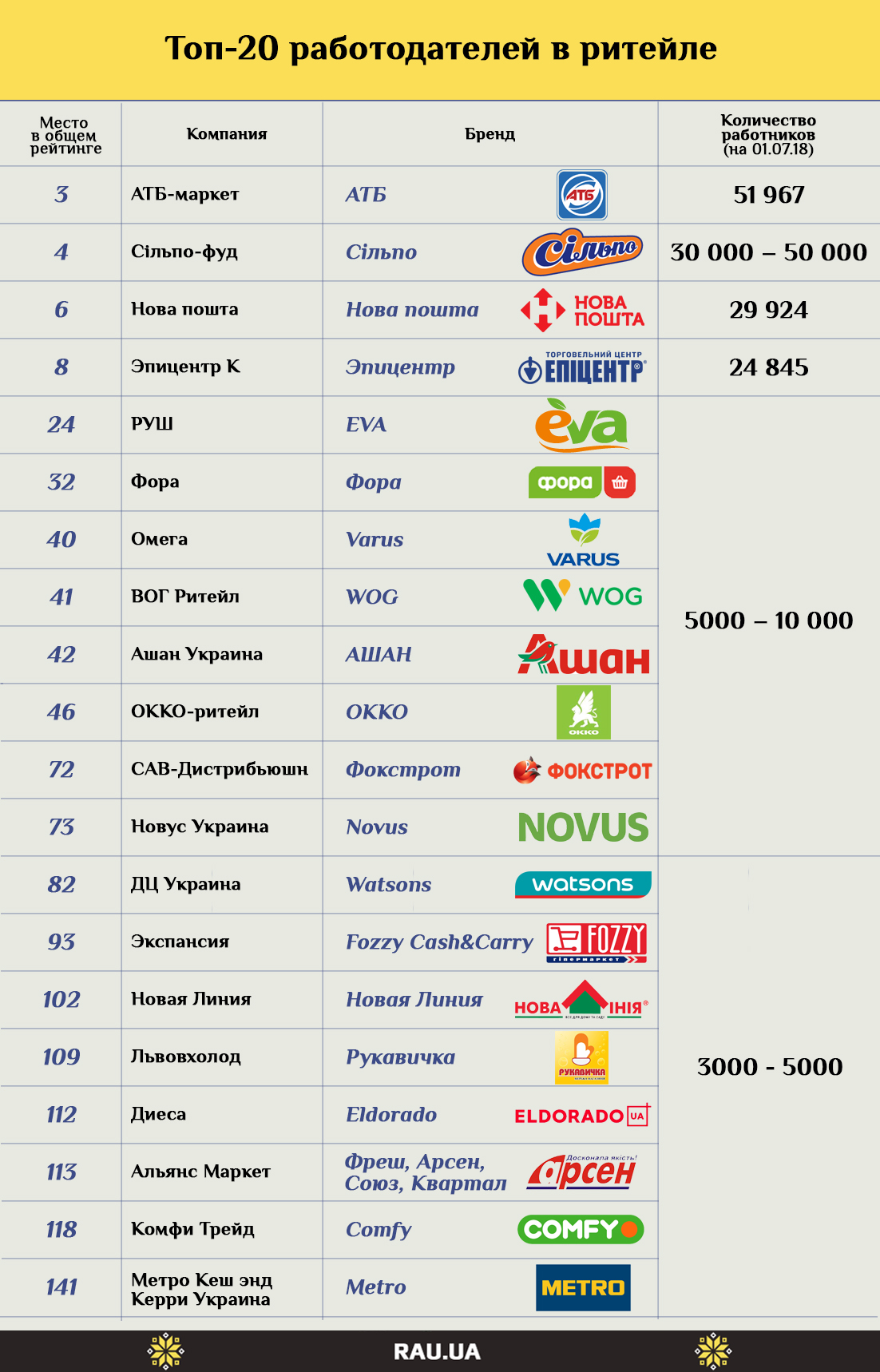 В целом, в рейтинге присутствуют все лидеры ритейла Украины. Сегмент продуктов питания представляют, кроме АТБ и Сільпо, Varus, Novus, Metro, группа Евротэк, Ашан, Рукавичка. Автозаправочные комплексы – две крупнейшие частные сети АЗС WOG иОККО. Товары для красоты и ухода – лидеры рынка drogerie EVA и Watsons. Магазины бытовой техники и электроники – сразу три оператора: Фокстрот, Eldorado и Comfy. Сегмент DIY – принадлежащие Александру и Галине Герега сети Эпицентр и Новая Линия.