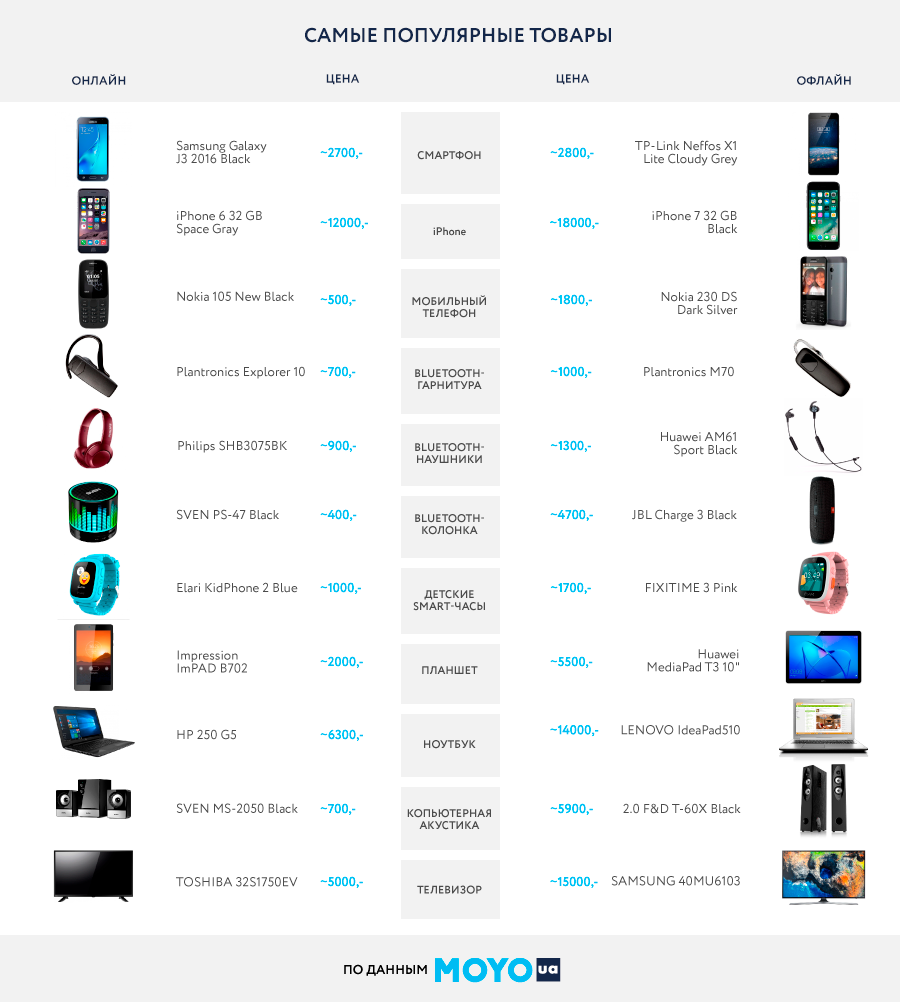 Аналогичная ситуация с телевизорами — в онлайне высокий спрос на TOSHIBA 32S1750EV с ценником в 5 000 грн., тогда как в розничных магазинах предпочитают приобретать SAMSUNG 40MU6103 за 15 000 грн. Самый популярный телефон на сайте moyo.ua в текущем году — Nokia 105 New, стоимость которого всего 500 грн., тогда как в розничных магазинах сети наиболее востребована модель Nokia 230 за 1 800 грн.