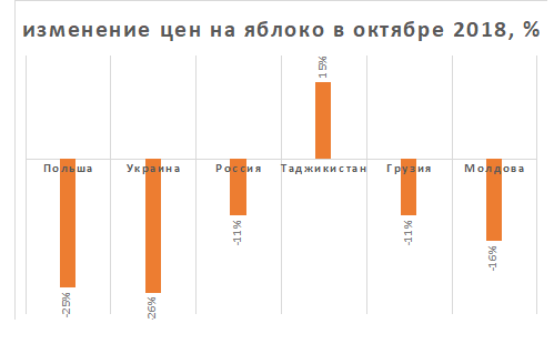 В самой России цены на яблоко упали за октябрь на 11%. Не последнюю роль в этом сыграло давление со стороны поставщиков из Молдовы и Сербии, а также реэкспортёров европейского и украинского яблока из Беларуси. Приблизительно так же снизились и цены на яблоко в Грузии, которая впервые столкнулась с проблемой перепроизводства. С ростом площади интенсивных яблочных садов в этой стране, проблема цен на яблоко здесь будет становится всё более острой.