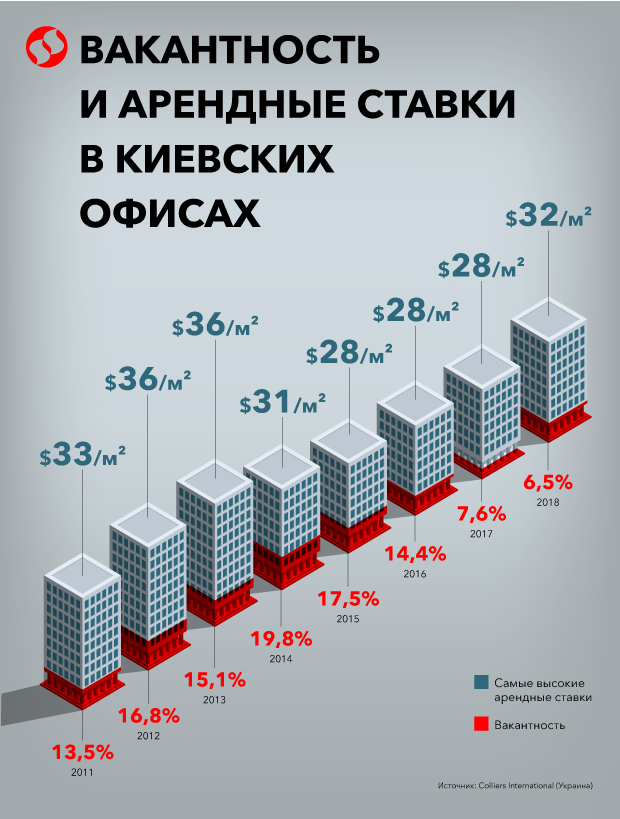 В сегменте офисной недвижимости вакантность в этом году составила 6,5%, тогда как в прошлом году — 7,6%, а в 2014 г. — 19,8%, свидетельствуют исследования Colliers International (Украина).
