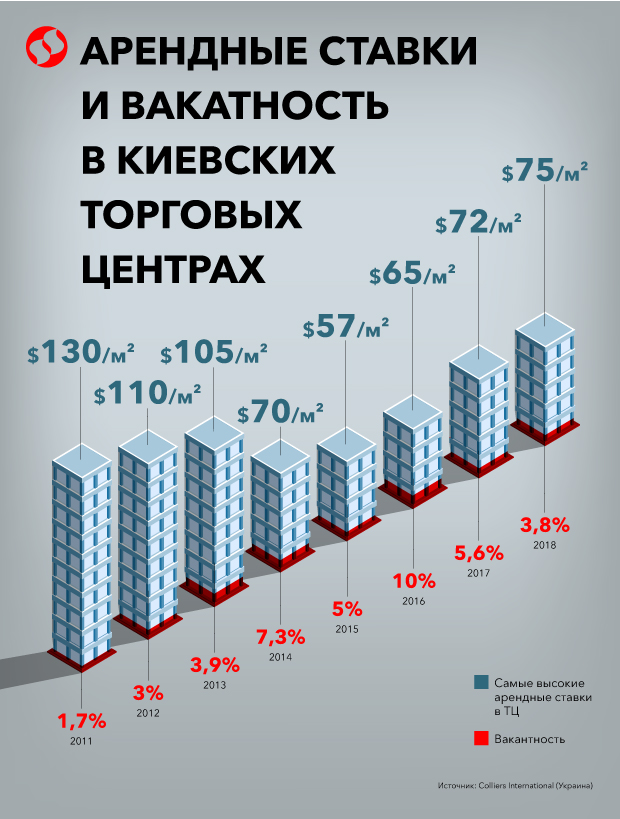 Максимальные ставки в офисах за этот же период выросли с $28 до $32 за кв м, сказано в исследованиях Colliers International (Украина). В отличие от предыдущих лет управляющие компании считают плату с привязкой по реальному курсу, тогда как еще два года назад устанавливали льготный курс.