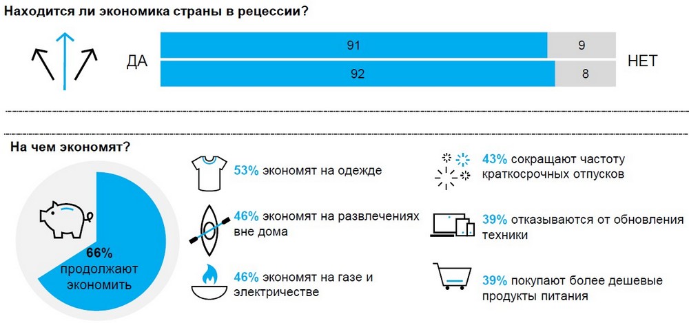Стабильным остается абсолютное большинство украинцев, которые продолжают считать, что страна находится в состоянии кризиса – 91% в третьем квартале 2018 года.  Количество тех потребителей, которые считают, что страна не выйдет из кризиса в ближайшие 12 месяцев, возросло до 76% по сравнению с 73% во втором квартале 2018 года.