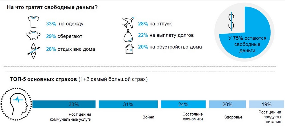 У каждого четвертого потребителя в Украине (25%) не остается свободных средств после покупки товаров первой необходимости. Те, у кого они остаются, покупают новую одежду (33%), сберегают (29%) и тратят на развлечения вне дома (28%).