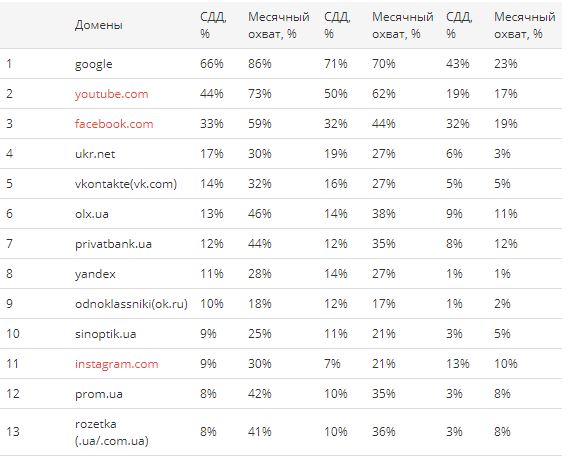 Компания Factum Group по заказу Интернет Ассоциации Украины (ИНАУ) провела исследования популярности сайтов среди украинских интернет-пользователей в ноябре 2018 года. Статистика приведена для пользователей desktop и браузеров Android, пишет blog.uamaster.com — блог интернет-агентства UaMaster.