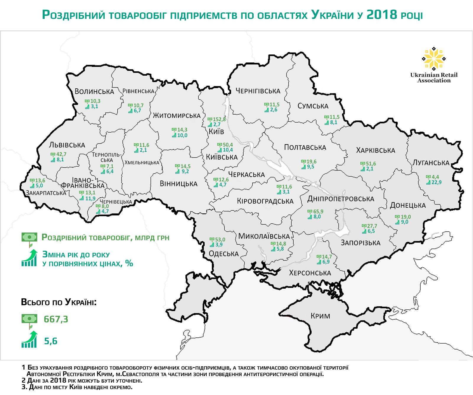 Если сравнивать с 2017-м, то темпы роста товарооборота ритейлеров снизились на треть: с 8,6% до 5,6%. Но при этом рост розничной торговли сохраняется третий год подряд. Есть и вторая хорошая новость: если в 2017 году в трех областях (Волынской, Луганской и Тернопольской) доходы ритейлеров снижались, то в прошлом – все регионы продемонстрировали рост. Правда, неоднородный.