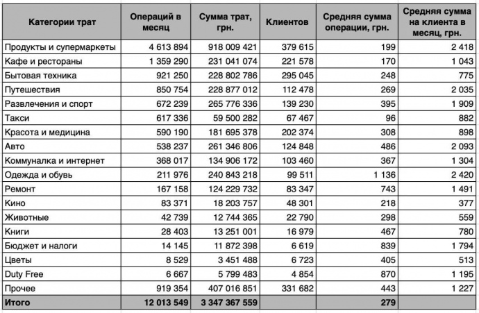 "Чаще всего наши клиенты покупают продукты и ходят в кафе и рестораны. Больше всего в месяц тратят на одежду и еду", - написал Гороховский.