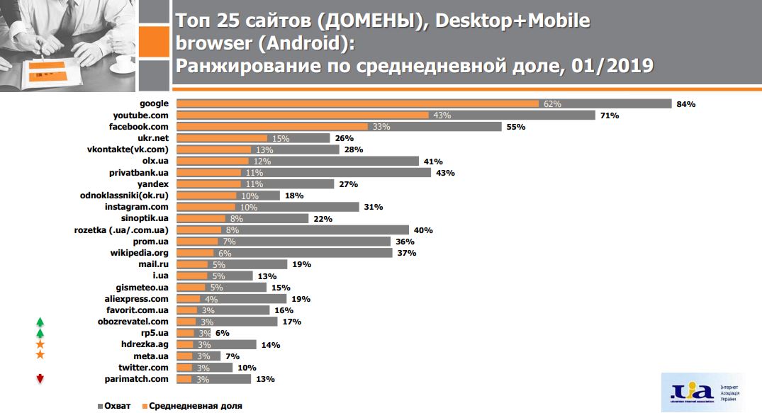 Компания Factum Group по заказу Интернет Ассоциации Украины (ИНАУ) провела исследования популярности сайтов среди украинских интернет-пользователей в январе 2018 года. В топ-25 попали и крупные компании сферы e-commerce и логистики - пишет RAU