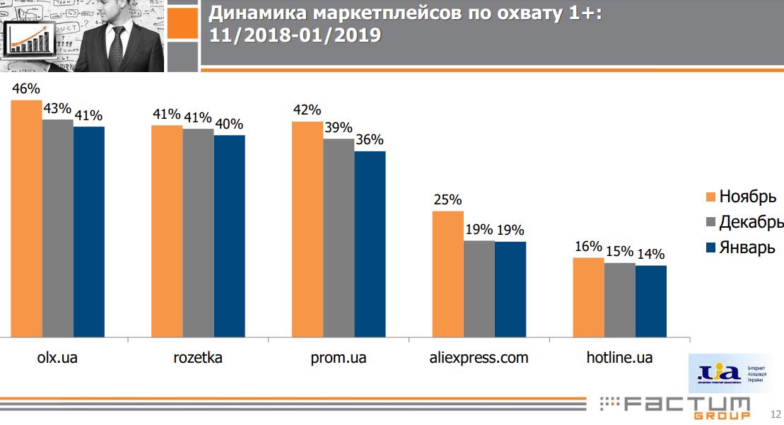 Благодаря данным исследования можно отследить динамику маркетплейсов, в топ-5 которых Factum Group Ukraine включила OLX, далее по уменьшению показателя идут Rozetka, Prom.ua, Alieхpress.com и Hotline.ua. Наиболее ярким месяцем был ноябрь — это хорошо видно на слайде по всем пяти игрокам.