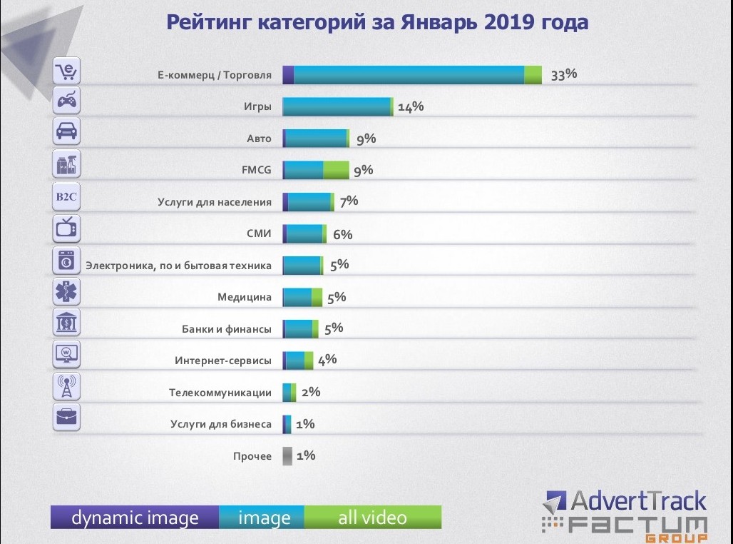 Исследовательская компания Factum Group Ukraine представила ежемесячный анализ активности украинских рекламодателей в сети интернет. Если брать все категории, то треть рекламы в UAnet размещают компании сегмента розничной торговли и e-commerce — 33%, заметно опережая другие сферы бизнеса - пишет rau.ua