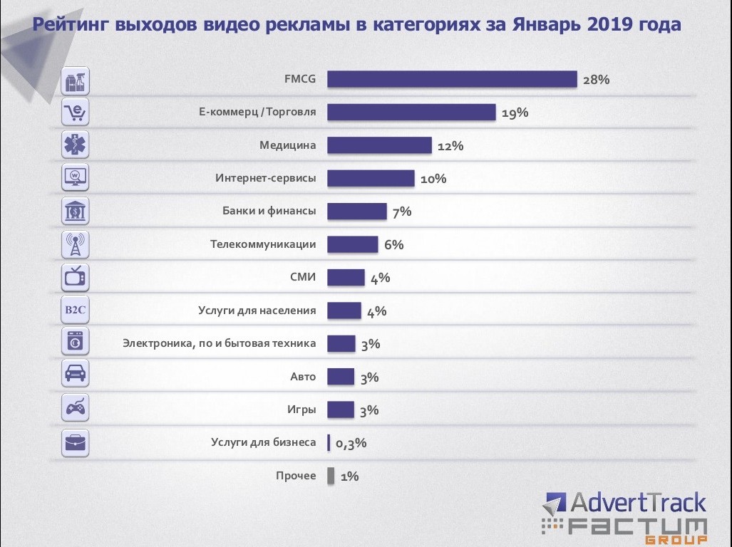 Любопытно, что производители и поставщики товаров для населения (категория FMCG) гораздо активней используют видеоконтент для привлечения внимания потребителей — 28% всех рекламных видео размещено именно брендами товаров широкого потребления.