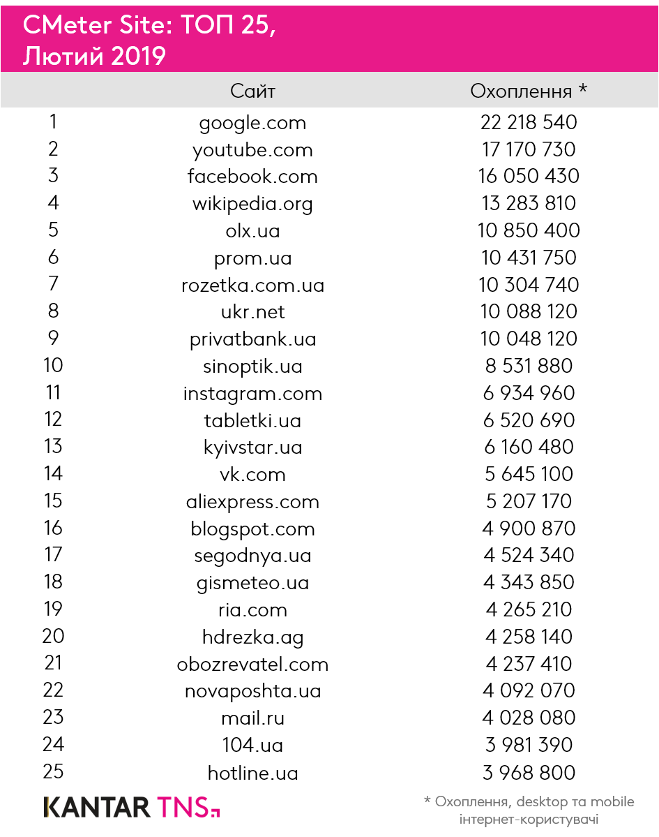 Согласно данным очередного исследования UAnet, проведенного TNS Ukraine, тройка лидеров остается неизменной: Google, Youtube, Facebook. По итогам февраля из рейтинга вылетел последний из интернет-магазинов техники и электроники: Allo.ua. Самым популярным порталом сферы e-commerce продолжает оставаться Rozetka.ua, хотя и тут произошла неожиданная рокировка - передает rau.ua