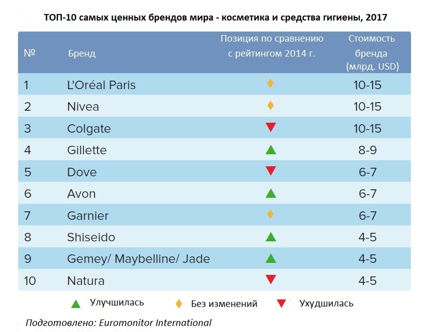 Ровно четверть списка самых ценных брендов мира составляют компании, производящие косметику и средства личной гигиены. Это вторая по величине категория в рейтинге TOP 100 Megabrands – 2017, подготовленном Euromonitor International.