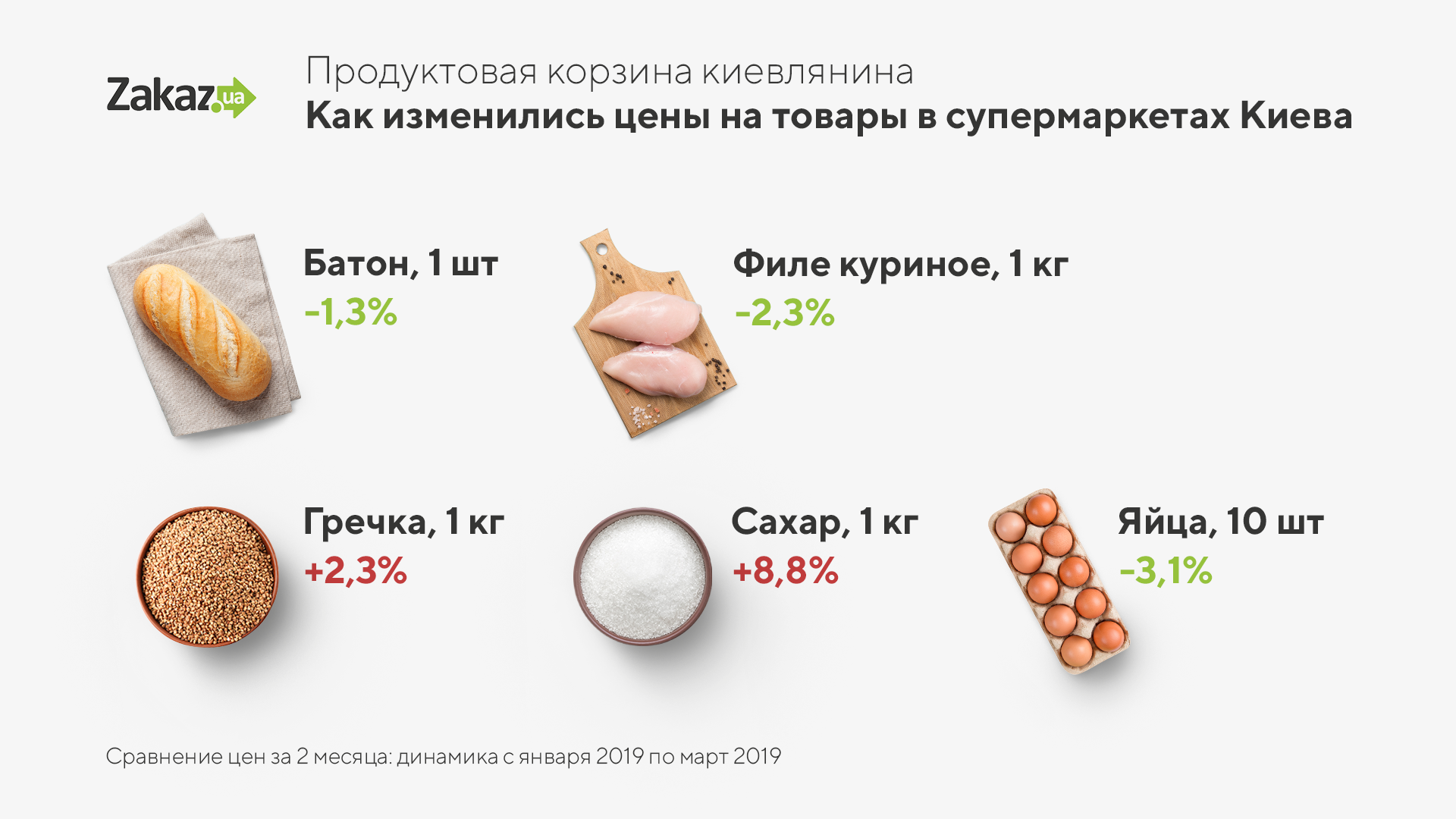 В целом за 2 месяца, с января по март 2019, цены в супермаркетах Киева на основную группу продовольственных товаров существенно не изменились и отражают картину в рамках ежегодного сезонного колебания, за исключением групп товаров, которые имели скачок более 10%.