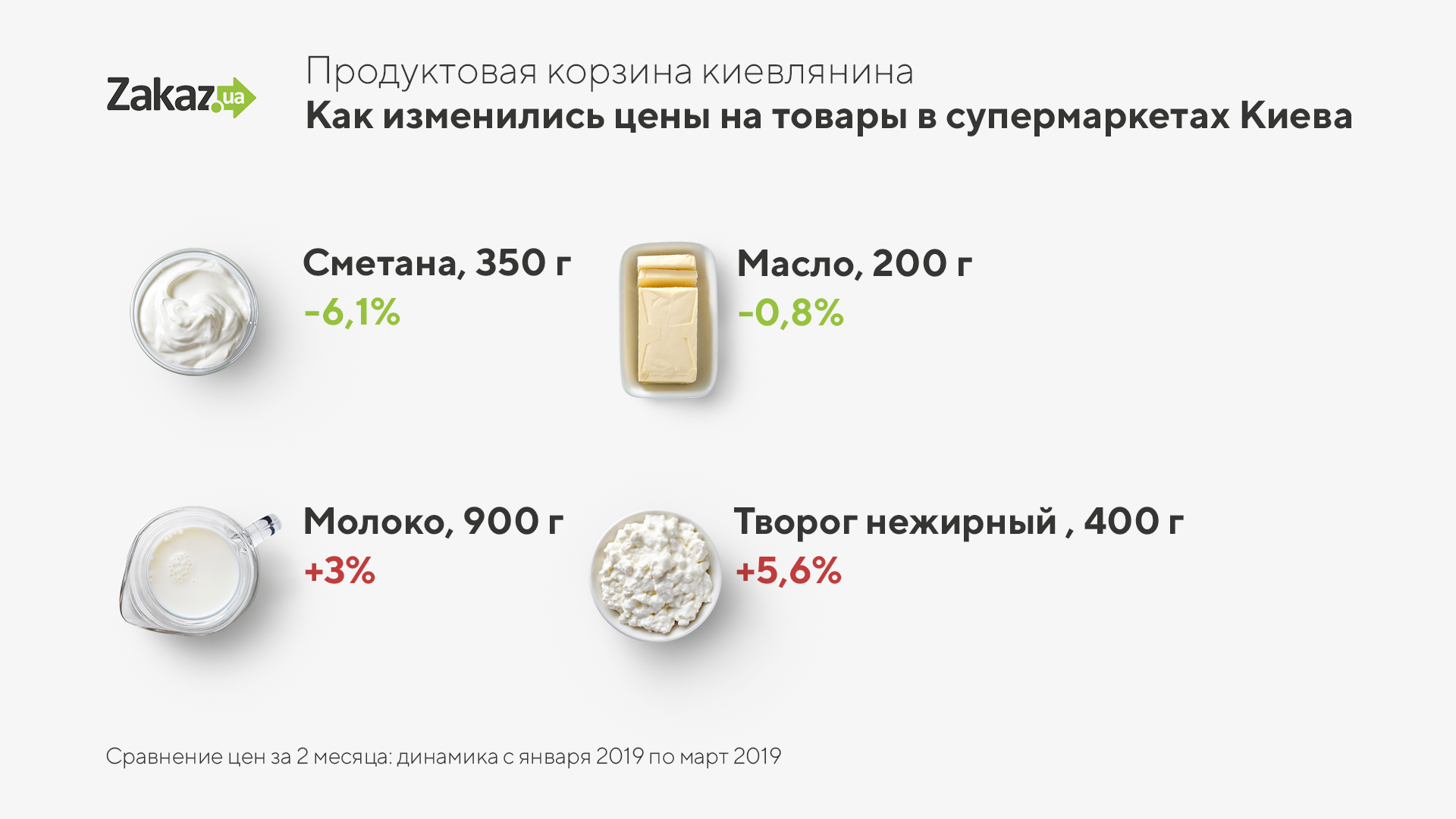 С января по март 2019 существует тренд на снижение средней стоимости сметаны. Цена снизилась на 1,5 грн. При этом цена на сливочное масло в марте осталась на уровне январской. Однако подорожали такие продукты, как молоко (на 0,70 грн) и нежирный творог (на 2 грн).